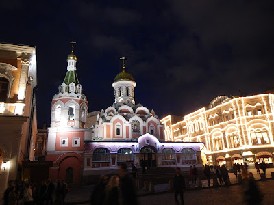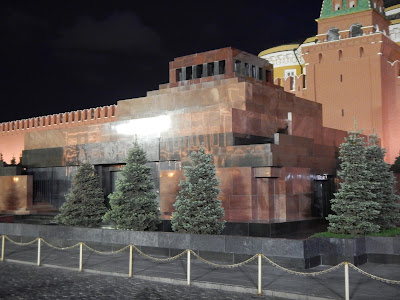 Red Square has a whole different look and feel at night, with the shopping Center wrapped in lights, and Lenin's tomb all lit up.
