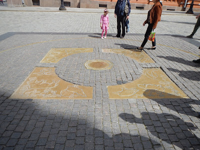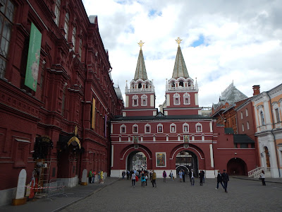 After leaving the Theater, it was another short walk to Red Square. Before entering the Iberian gate into Red Square we see a plaque on the ground, Kilometer Zero is where all distances are measured from in Moscow. Tourists are standing in front tossing a coin over their shoulder to try to please Lady Fortune. If their coin lands on the plaque, Lady Fortune has blessed them with good luck. Apparently it's bad luck to pick up the coin, but there is a couple people standing around eagerly picking up the tossed coins and fighting over them.