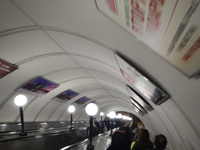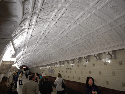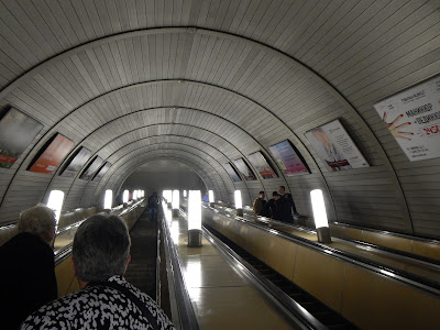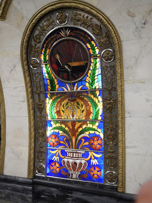 The architecture is vastly different station to station, the ceilings and walls are filled with mosaics depicting the times they were built, one station was like a church with its stained glass... we could have rode all day checking out all the different stations, but our cat wrangler Anna gathered us up without losing anyone, and we headed up the super steep escalators back to street level and loaded into our bus.