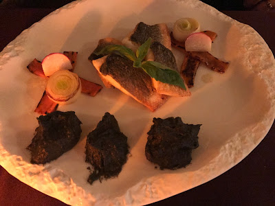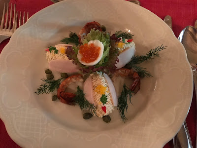 The table they provided was 2 people too small for our tour group, so we decided to split up our group by nations... all the Americans sat at the table of 10, and us 2 Canadians had our own private table for two. The meal was spectacular, it was our first serving of caviar as part of the appetizer. The Black lumps are just mashed potatoes... coloured with octopus ink. All wrapped up with an amazing piece of cake.