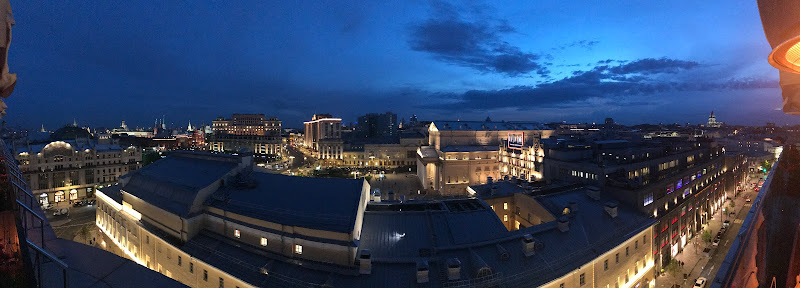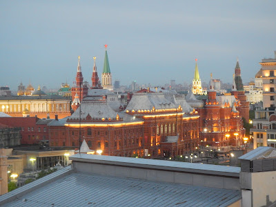 After settling in and meeting with our tour guide Anna Bistrzhizkaya, to outline our next few days we headed up to the 10th floor rooftop for a dinner at the Conservatory overlooking the city, and the seemingly never ending sunset. Right in front of us was the Bolshoi Theater and all around us you could see historic government buildings including the Kremlin and Red Square, and a variety of Modern neon lit buildings and old onion domed structures.