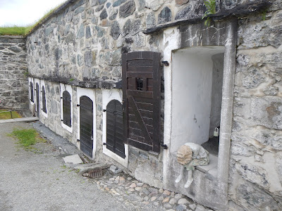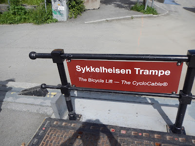 For people riding their bikes up the hill towards the Fortress there is the Sykkelheisen Trampe, a bicycle escalator. The Sykkelheisen Trampe is the first and only bicycle lift in the world. The prototype was built in 1993 in Trondheim and was removed in early 2012. In 2013 it was replaced with updated technology under the name "CycloCable". You place your right foot on the starting point (the left foot stays on the bicycle pedal), and then push the start button, a little footplate emerges under your foot and you are pushed forward up the hill. If your foot comes off the plate, it drops down out of sight, and you can try again. We watched a couple trying to use it for almost 30 minutes, then some old guy comes up and away he goes no problem. The couple ended up walking their bikes up the hill.