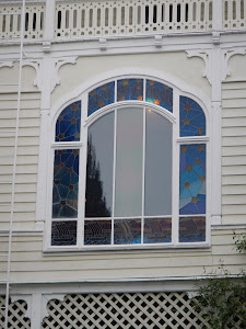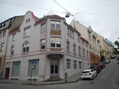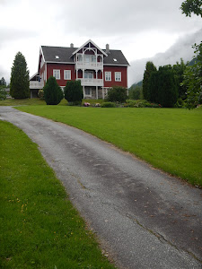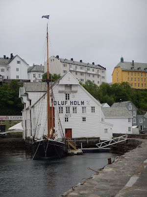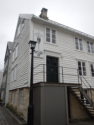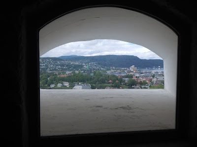It's an interesting building, and we are encouraged to go explore, the gallery is closed, but we are allowed to just go wander around and look at her water colours of scenes of Norway, and look at his impressionist paintings of naked women. Upstairs it is like a museum/swap meet, oddities from days gone by scattered around many rooms, and on the very top a steep stairway takes you to a glass dome where you can look out at the fjord, the mountains and the town.