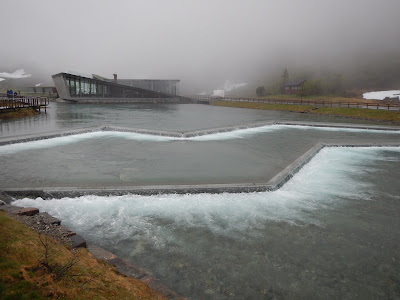 The view at the Gaularfjellet lookout was spectacular when we first arrived, and then the clouds rolled in and it wasn't so spectacular anymore. This entire area was rather stunning once we got out of the clouds, from it's switchback roads and snowy mountains to its traditional grass roof homes and frozen lakes.