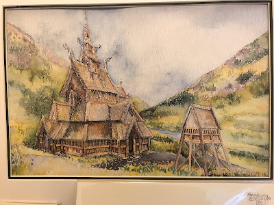 As we were about to leave, we paid the bill and complimented the owner on her artwork, I especially liked the paintings she had done of the 2 churches we saw in Vik. She thanks us for taking the time, and says she has something for us. She comes back and gives Norine a birthday calendar of her artwork, and gives me two cards, each one with the paintings that I mentioned.
