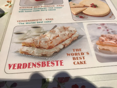The menu's were true Norway, I ended up going with an Elk and reindeer combination plate, I just couldn't bring myself to eat whale. Norine went the safe route and got some local salmon. Of course we couldn't turn down what was touted as The World's best cake, and I do have to say, that was some pretty damn fine cake, so flavourful.