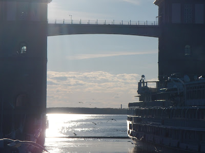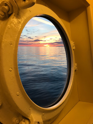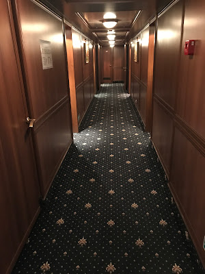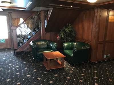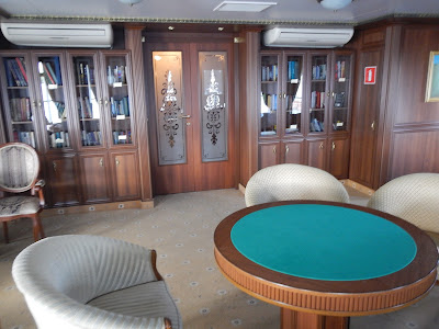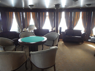 Having finished our vodka, we headed down the hallway to check out our room and the ship, nicely finished with wood and brass, it really was quite a nice ship. A large restaurant and lounge, a library, several deck areas you could just sit and relax, even a small gym. Speaking of small, the room wasn't huge, but it had what we needed, a bed, a bathroom, and large windows to look out of.