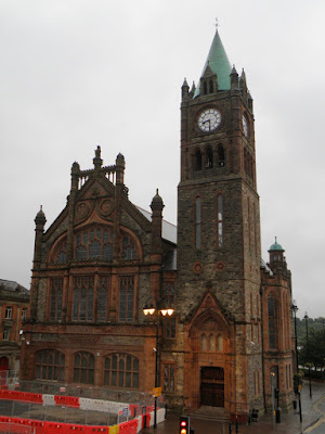 From the walls we get a great view of the 1633 gothic Cathedral of St Columb and the Church of Ireland. One building is all boarded up and a vine is overgrowing a window, but there is still a hanging plant. It's an interesting mix of historic, damaged and modern, that makes Derry unique.