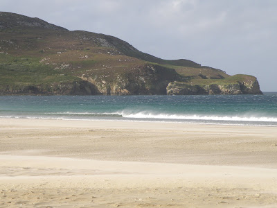 Along the way we stopped at Dunfanaghy beach, which you have to get to by crossing a golf course. Happily there is porta-potties in the parking lot, but the doors nearly blow off in the wind. The wind is blowing layers of sand across the beach, sunglasses provide some protection from the stinging, it's no surprise that there is only a few people still hanging around at this nice beach.