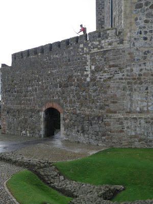 From the castle walls we look down onto Carrickfergus Harbour with Belfast in the background.