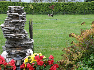 The room is very quaint, a mix of grandmas house and colour coordinated fabrics, there is even a night-gowned teddy bear on the bed. A glass door opens onto a patio and we look out onto the backyard at a small fountain, and the collection of farm animals that make the cottage unique.